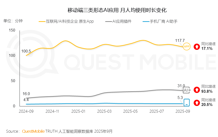 当前,移动端 AI 应用(原生 App + 应用插件)整体月活跃用户量达 7.29 亿,用户使用粘性与时长攀升至新高度。其中应用插件增速领跑,2025年 9 月 “TOP 50 AI” 应用中,In-App 形态插件占 31 个,月人均使用时长同比增幅达 93.8%,这些数据表明用户更习惯于在熟悉应用中调用AI能力。