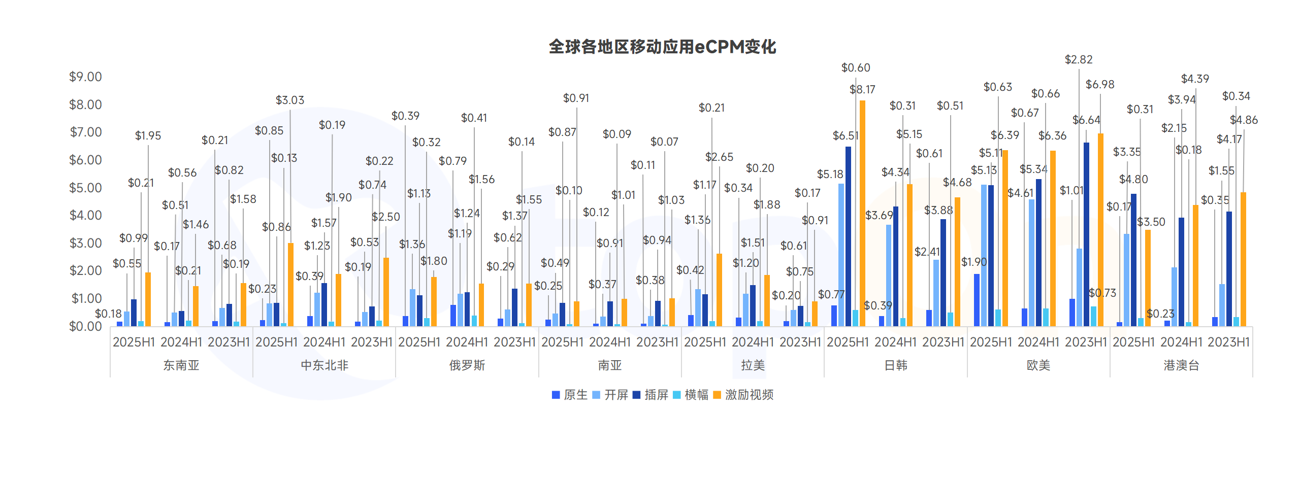 从全球市场看:2025 年全球各区域 eCPM 整体呈上升趋势,拉美、日韩等高价值区域虽有局部波动,但整体来看增长显著,广告变现价值持续提升。