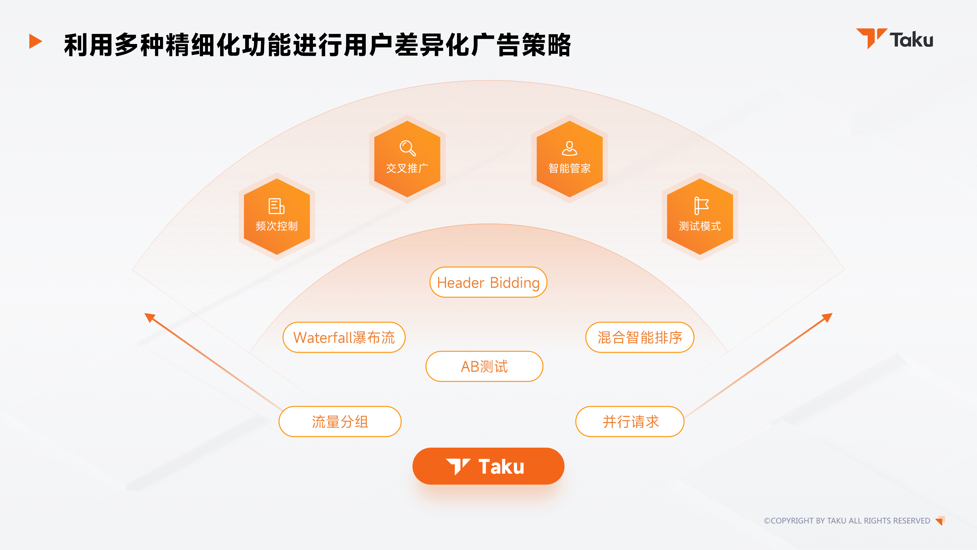 Taku 提供 AB 测试、并行请求、流量分组、混合智能排序等功能,助力开发者多维度精准变现;同时配套 6 大核心报表(综合报表、留存价值报表、用户行为报表、分小时报表、漏斗分析报表、ROI报表),辅助开发者高效分析广告数据,直观掌握各维度数据健康状况,快速优化调整,实现收益突破。