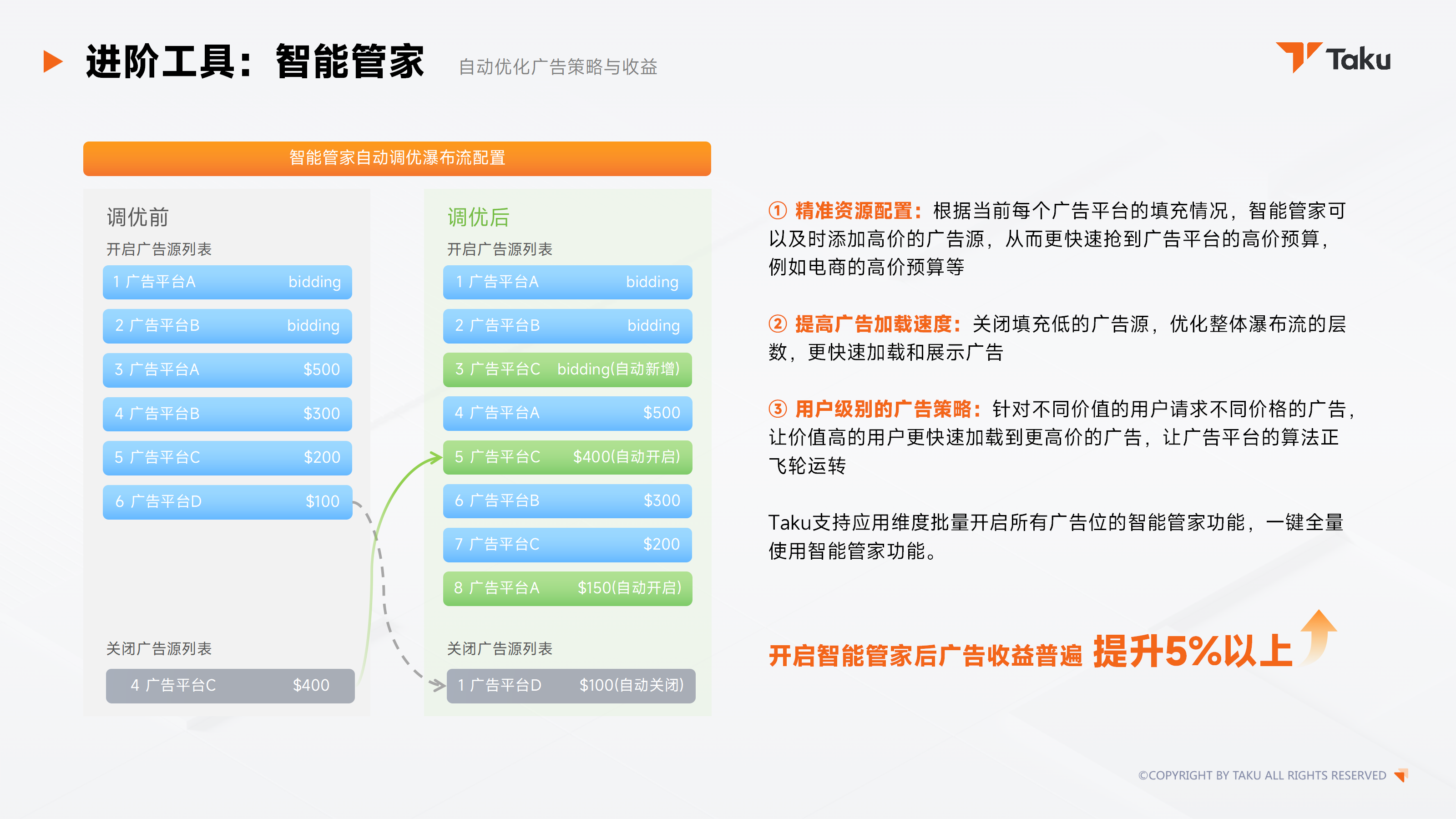 Taku 提供的智能管家工具,能够帮助开发者在激烈的变现角逐中节省更多时间与精力 —— 无需时刻盯盘,数据异常、填充率低等问题可一键解决;更能针对不同价值用户自动匹配广告策略,驱动算法正飞轮持续运转,助力开发者冲刺更高收益峰值。