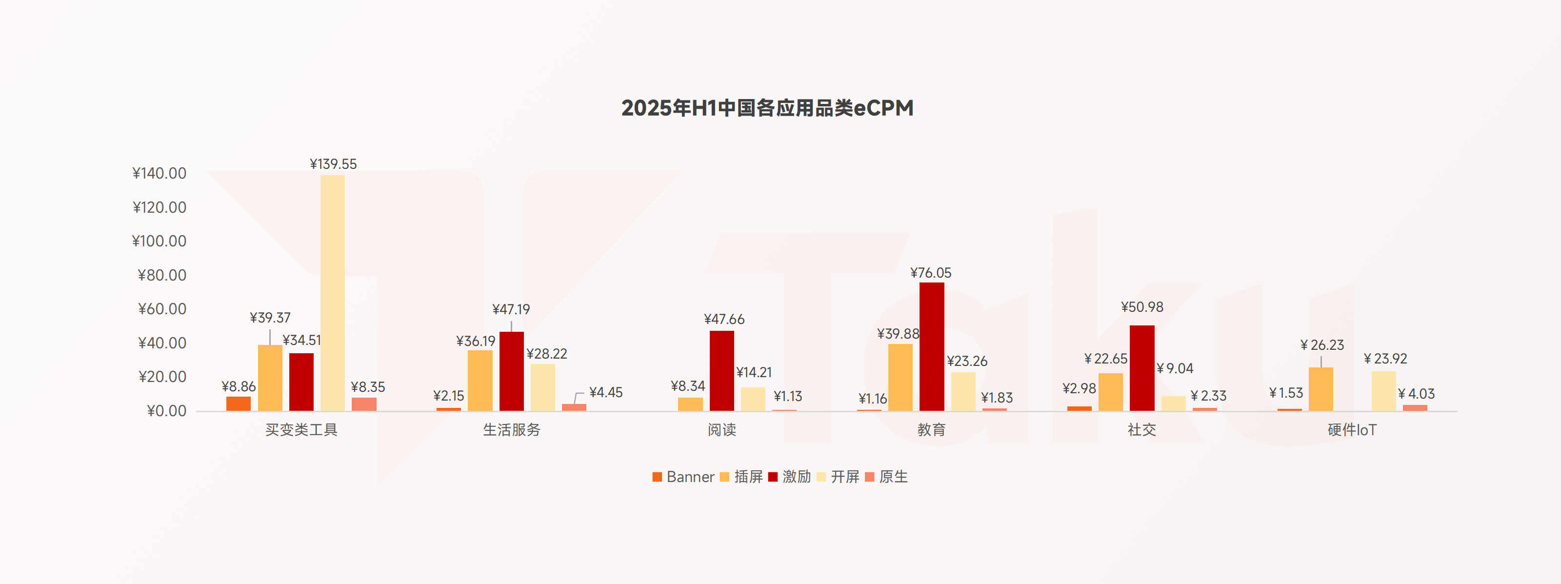 从中国大陆市场看:激励视频是多数应用的主要广告形式,而 2025 年上半年受 618 大促影响,广告主增加开屏、插屏等更直观形式的投放,使其与激励视频的 eCPM差距缩小。原生广告在买变类工具、生活服务和 IoT 品类的表现较其他品类更优,这是因为今年不少产品通过自渲染优化原生广告效果,使其相较其他形式更为“隐形”,能够减少对用户的打扰。