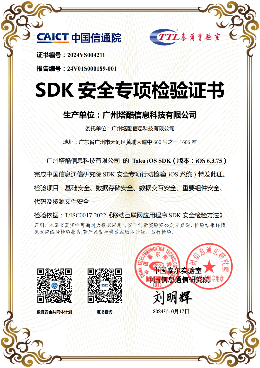 Taku双端SDK已通过中国信通院SDK安全评测!