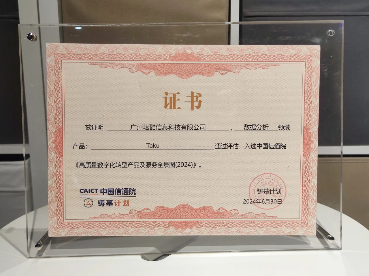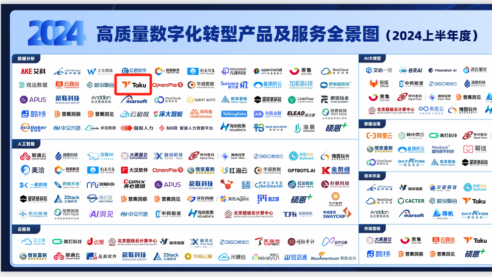 2024年9月24日,由中国互联网协会中小企业发展工作委员会主办的“2024大模型数字生态发展大会暨铸基计划年中会议”在北京成功召开,大会聚焦于大模型数字生态的发展,吸引了来自各行业的专家学者和企业家们。作为中国先进的移动广告聚合管理平台,Taku 受邀出席此次盛会,并见证了中国信通院《高质量数字化转型产品及服务全景图(2024上半年度)》的发布。Taku 成功入选该全景图的数据分析板块,标志着 Taku 在推动行业数字化转型方面取得了重要成果。
