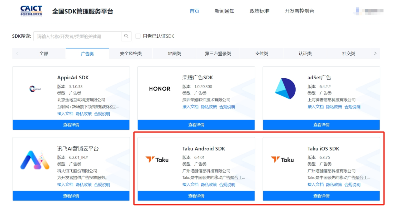 Taku 自推出以来,一直坚持“100%中立透明”的服务立场,严格遵守相关法律法规,确保广告内容和投放方式符合规范,为开发者营造安全健康的开发环境。为了更好地服务于开发者,提升 SDK 合规水平和服务能力,Taku SDK 已成功入驻中国信通院全国 SDK 管理服务平台,为开发者提供了更加便捷的服务渠道。