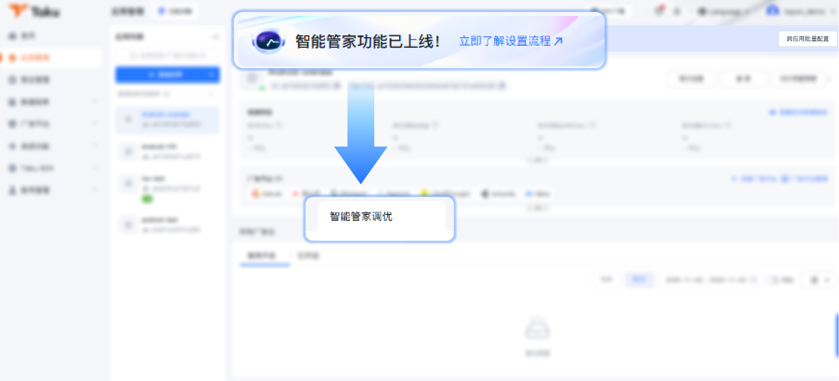 开启智能管家功能,即可动态判断瀑布流广告源增减(支持样式混用),还会根据收益数据自动创建三方广告位;遇到冻结/删除的无效广告源,系统会自动过滤不启用;更能通过一个入口一键开启所有广告位的智能管理。