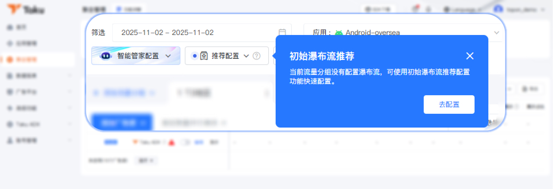 无需从零摸索,Taku初始瀑布流推荐功能兼容不同品类、地区、量级的APP场景,系统能够根据所填信息提供智能化推荐,后续可基于初始配置不断完善优化,帮助开发者缩短变现准备周期,同时依托大盘数据保障初版配置可靠性。