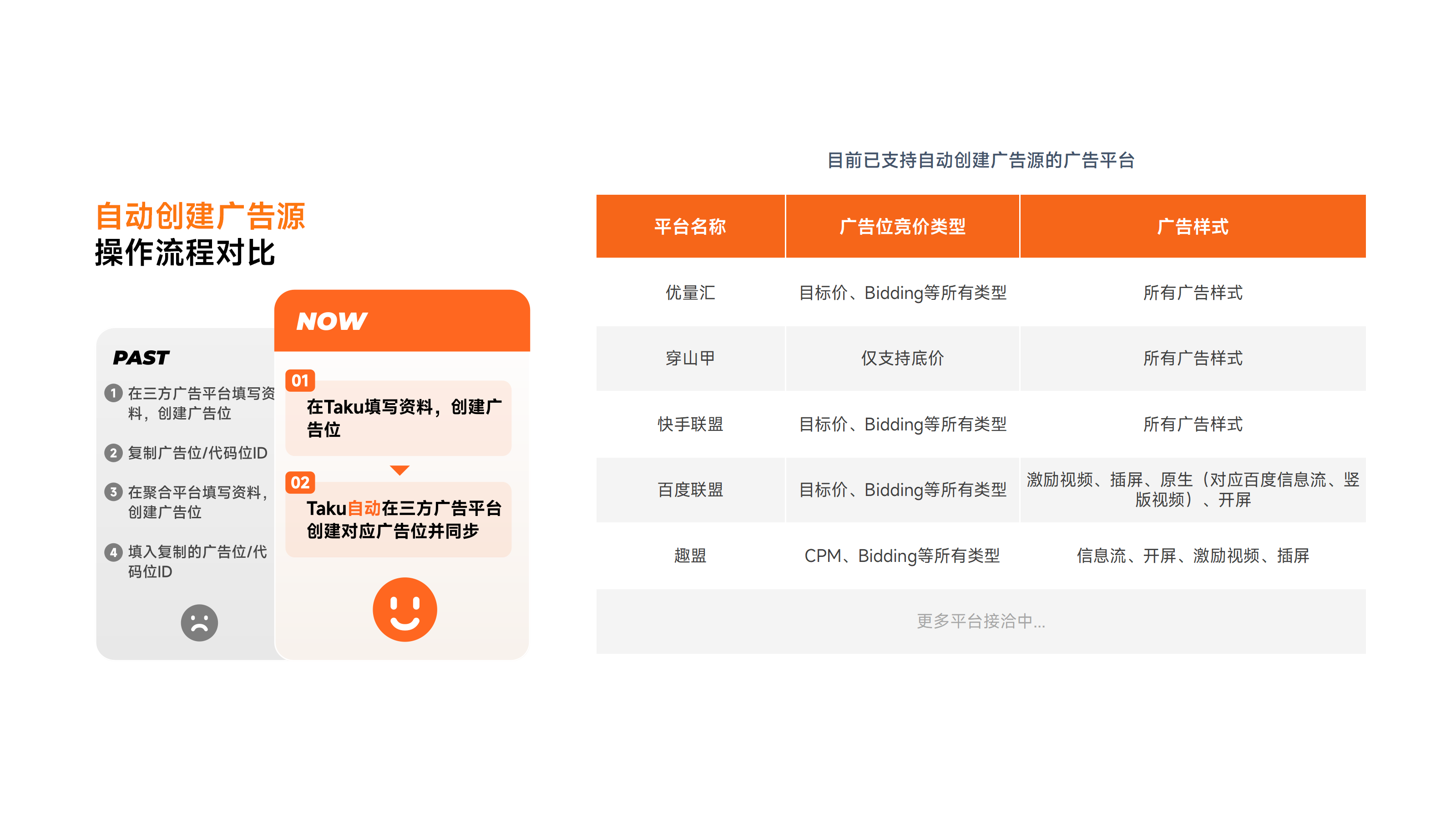 创建广告源是开启变现的基础,以往逐个平台跳转创建、手动录入信息,不仅耗时还易出错。如今开发者可通过Taku管理后台批量添加、自动创建广告源,彻底告别 “反复核对、低效操作”。节省 50% 以上的广告源配置时间,帮助开发者高效完成变现前的基础准备。