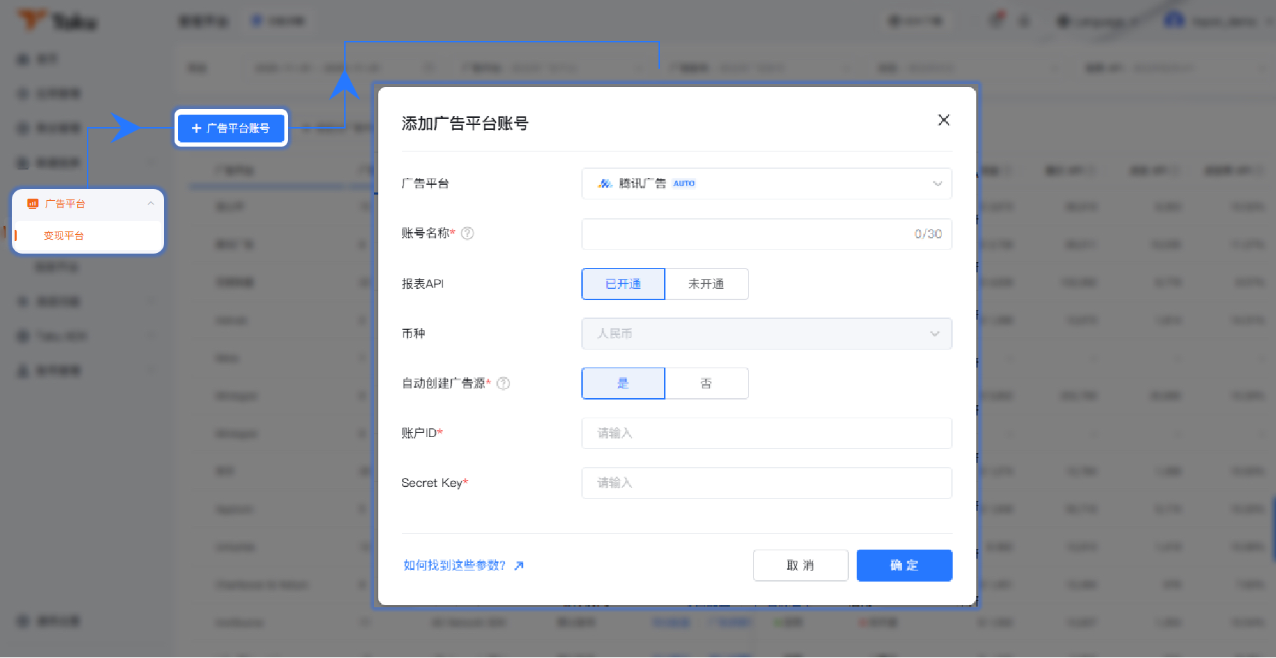 (2)打开Taku后台-广告平台-变现平台,新增您的广告账号